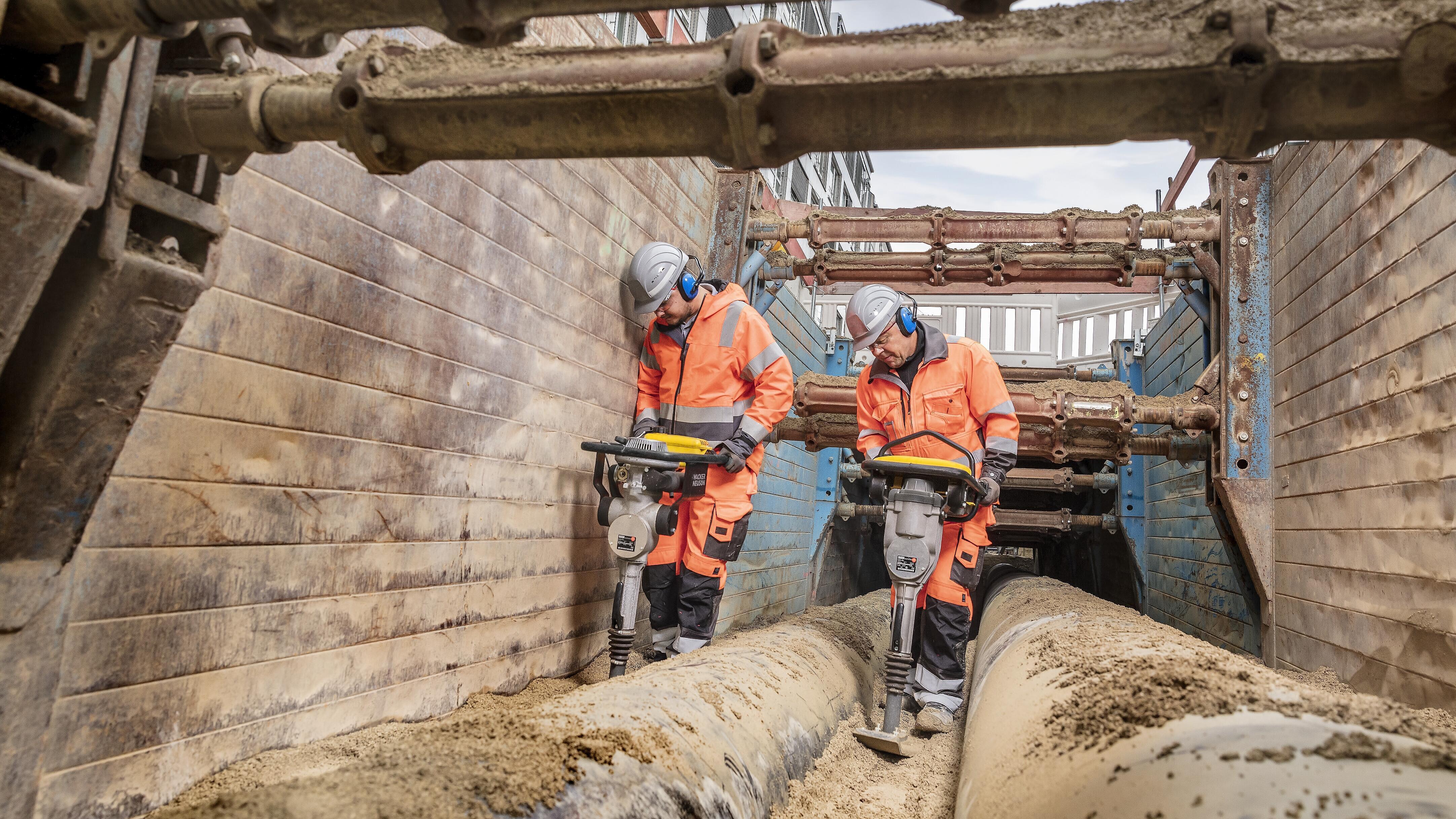 The Wacker Neuson vibratory rammers had the opportunity to demonstrate their full strengths in the confined spaces on the construction site: as these are flexible and powerful machines, they were ideally suited for the work in trench shoring and were used for the compaction of the materials in the pipe branch points as well as at the sides of the pipes. Besides the classic 4 stroke rammers, various 2 stroke rammers were also put into use. Also, the battery-powered rammers scored points on compaction work in trenches: their fully emission-free working principle protects the operators and persons in the construction site environment from exhaust emissions.